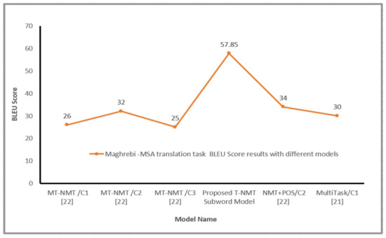 Table 2 illustrates the findings of the suggested model on test dataset for the MAG–MSA translation task. We observed that the proposed Transformer-based NMT subword model, as shown and highlighted with bold text in Table 2 is able to translate the Maghrebi Arabic sentences to MSA with a 65.66 BLEU score. It is clear that Maghrebi vernacular is a combination of many diverse languages such as the Berber language, African Romance, old Arabic expressions, Turkish language, Spanish, Italian and Niger Congo languages, as well as some new vocabularies borrowed from French and English. Therefore, the proposed Transformer-based NMT subword system was able to capture the semantic and syntactic features of Maghrebi dialect and improved the translation performance on the (MAG)–MSA translation task despite that the Maghrebi dialect is not close to the MSA in terms of expressions and vocabularies. Conventional NMT models [21,22] were not able to produce a high translation quality for the Maghrebi vernacular because Maghrebi dialect has expressions from many other languages. By utilizing subword units as an input to the encoder, there will be a sharing of information between the subwords forms and words forms and the model will generate MSA sentences with high quality.