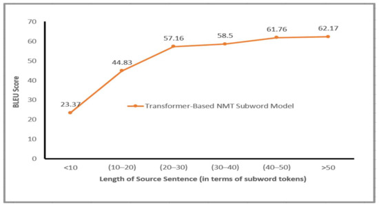 Obtaining contextual information and long-distance dependencies between the source sentence’s tokens can considerably increase the performance of longer sentences’ translation. As mentioned by (Luong et al. [47]) sentences that have the same lengths (number of source tokens) are collected together. The grouping is arranged by the lengths of source sentences (the number of subword tokens in every source sentence) over the MAG–MSA test set. We selected the MAG–MSA translation task to investigate the translation quality of long sentences because of the large size of the MAG–MSA corpus. The comparison in this research project is based upon these lengths: >50, 40–50, 30–40, 20–30, 10–20 and <10. Regarding every length interval, BLEU score metric is computed for the output of the suggested Transformer-Based NMT subword model. As can be noted in Figure 6, the proposed model performance improves while the input sentence lengths increase, particularly for the lengths between 40 and 50 subword tokens and for the lengths larger than 50 subword tokens with 61.76 and 62.17 BLEU scores, respectively. The proposed model, through the use of self-attention sublayers, is capable of modeling or obtaining contextual knowledge and dependencies within the tokens regardless of their distance or location within Arabic dialect sentence input. However, the performance of the suggested model decreased for very short sentences that have lengths smaller than 10 (in terms of the number of subword tokens). The performance increased for sentences with lengths larger than 50 (in terms of the number of subword tokens). Moreover, the proposed model performed inadequately on few numbers of short sentences with length less than 10 subword tokens with the lowest BLEU score (23.37). This occurs because these very short AD sequences contain only subword tokens (suffixes, affixes and morphemes) and they are cannot be aligned to the corresponding words in the target language. Overall, the performance of the proposed Transformer-Based NMT subword model obtained across the different groups motivates the hypothesis that employing subword units and using shared vocabulary between source language (Arabic dialect) and target language (MSA) enhances the encoder’s self-attention sublayers’ effectiveness in effectively capturing the global dependencies between words in the input sentences.