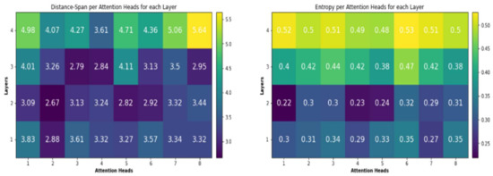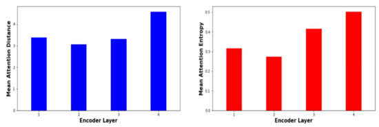 where indicates the number of attention heads that are used within the layer. Mean attention distance provides no information about how the attention weight is distributed through the input tokens for a particular attention head. Attention head that has greater mean attention distance may concentrate on sequences of same tokens that are separated [49,50]. To estimate the dispersion or concentration pattern for attention head inside layer for input token , entropy of attention distribution [50], for attention head is calculated as: