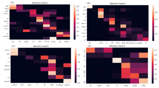 The proposed model provides a method of examining the alignment of words in generated translation with words in source sentence. This method is performed through the visualization of annotation weights as illustrated in Figure 9. Every row of the matrix in every plot indicates the weights linked with the annotations where the x-axis represents the input sentence (Maghrebi Arabic) and the y-axis represents the generated sentence in MSA. This reveals which locations in the source sentence were rated more significant when the target word was generated. As illustrated in Figure 9, the alignment of words between Maghrebi Arabic (MAG) and MSA is primarily monotonic. Along the diagonals of each matrix, we see strong weights. Although, we see several non-trivial, non-monotonic alignments. Typically, nouns and adjectives are ordered differently in MAG and MSA, as illustrated in the upper left part of Figure 9. From Figure 9, we see that the model correctly translates a MAG dialect sentence ( اسكر عليا برا تقدر تفتح بابي لو سمحت) “it has been closed from outside, can you open my door please” into MSA sentence (لقد اغلق علي الباب هل يمكن ان تفتح بابي من فضلك ؟) “the door has been closed while I am inside, can you open my door please”. The proposed transformer-based NMT subword model was able to correctly align (اسكر عليا برا) “it has been closed from outside” with (لقد اغلق علي الباب) which means “the door has been closed”, the proposed model was able to understand the contextual clues (الباب) “the door” of Maghrebi Arabic and translated the MAG sentence to MSA correctly. Additionally, the model often handles source and target sentences of variable length. Furthermore, sub-word units approach can be applied on various Arabic NLP tasks such as sentiment analysis [51] and text summarization.