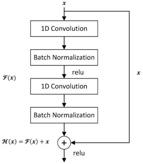 The Residual Neural Network (ResNet) [] applies residual learning to construct the model. Residual learning could settle the problem of vanishing/exploding gradients, and residual learning is defined as Equation (2):
