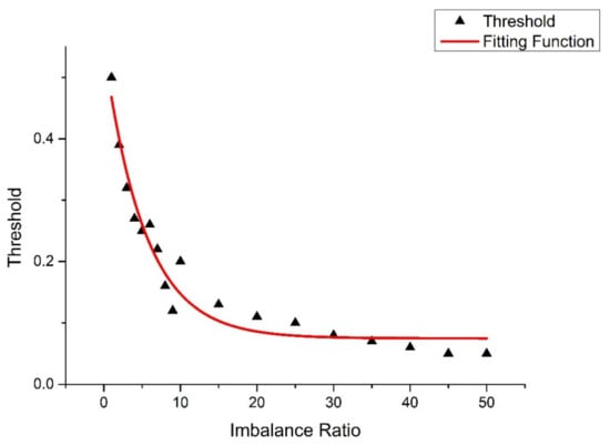 In the experiment, it was noticed that the threshold is related to the imbalance ratio of the dataset. The higher the imbalance ratio of the dataset, the more biased the threshold towards the minority class. In order to determine the relationship between the two, the preprocessed data are randomly selected to form a dataset with different imbalance ratios, and the thresholds under different imbalance ratios are determined based on the above method. The relationship between the imbalance ratio and threshold is fitted according to the experimental results as follows: