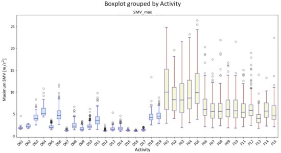 After comparison, the SisFall dataset [] is found to be the most suitable for this experiment. The SisFall dataset is generated with the collaboration of 38 volunteers (23 young adults and 15 elderly people). Moreover, there are 19 types of ADL events and 15 types of fall events in the dataset. The data are collected by two accelerometers and a gyroscope, which are worn on the waists of participants. In order to collect all the features of activities, the sensors are operated with the original frequency sample of 200 Hz. Figure 5 shows the distribution of the maximum of signal magnitude vector () values for all data in each type of event, and the SMV can be computed as: