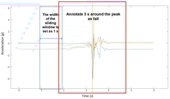 In initial fall event files, there is a long period of activity before the actual fall data. Sampling is performed at 3 s around the peak values in initial fall event files and they are labeled as falls. Then, all data are augmented by using a sliding window strategy in order to obtain the samples, and the width of the sliding window is set as 1s. The segmentation of the original data and the method of sliding window are shown in Figure 6. The preprocessed dataset includes 94,786 ADL events and 8439 fall events. In consequence, the imbalance ratio is 11.23 and the threshold of experiment is set as 0.1.