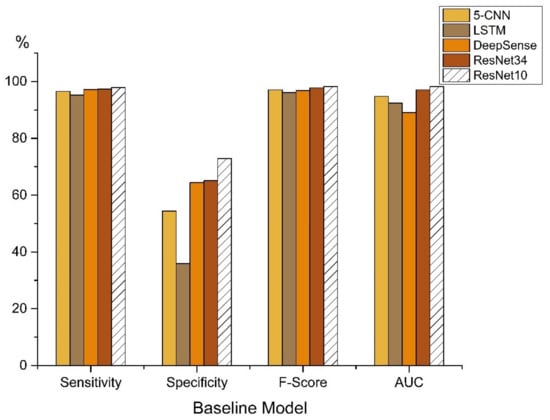 In Table 4 and Figure 8, the results of these models are summarized. As shown in the table, the ResNet model performs significantly better on this dataset when compared to the other models. As very deep networks harm the generalization performance of the classifier, ResNet34 has poorer performance than ResNet10. In the last five baseline models, ResNet10 performs the best among all evaluation methods. It reaches an F-score of 98.25% and an AUC of 98.27%. In particular, the ResNet10 model achieves specificity of 72.89%, which is 36.98% higher than that of the LSTM model. These baseline models can successfully find the features within given sensor data, but the specificity is not high due to the bias of the majority group on the class-imbalanced data.