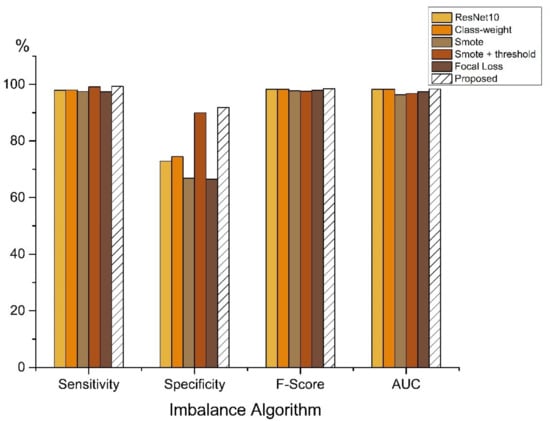 Data-level algorithms mainly include over-sampling and under-sampling. In binary classification problems, over-sampling is the duplication or generation of samples from the minority group. In the Synthetic Minority Over-Sampling Technique (SMOTE) algorithm [], new samples are generated along the line between the minority examples and their selected nearest neighbors. Lee et al. [] proposed a two-phase learning method that combined under-sampling with transfer learning to solve the high imbalance problem. This method pre-trained a deep CNN by randomly under-sampling the majority group, and performed fine-tuning using all data.