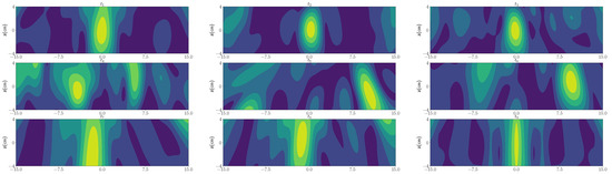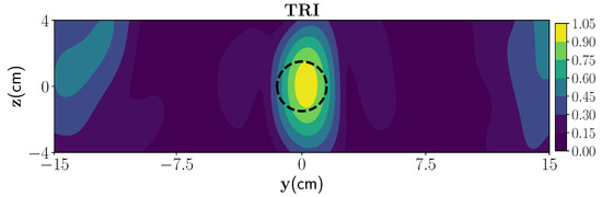 In this section, TR-DORT imaging simulation results are demonstrated using the derived asymptotic Green’s function for different moisture scenarios. To generate the synthetic electric-field data, the 3D scenario of the MWT schematic shown in Figure 2 is developed in the commercial software CST Studio Suite with time-domain solver. In the 3D setup, the foam with dimension is chosen and the open-ended waveguide antennas is placed in free space at a distance of from top of the foam. The MDM matrix is extracted for the bandwidth of with the center frequency of (X-band range) and the number of frequency is . It should be noted that the response of the antennas is removed from the measured S-parameter using a calibration proposed in [44,45]. In this study, the dielectric constant of the dry polymer foam is assumed to be known and is . The wet-spots are modelled by a spherical shape with the defined dielectric constant corresponding to the different moisture levels. The correlation between the dielectric constant and the wet-basis moisture levels is measured by cavity-perturbation method as well as transmission line technique at 2.45 GHz [46]. For this characterization, the polymer foam density is .