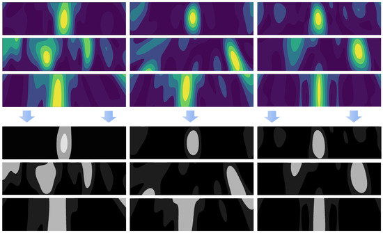 To comprehensively help people to understand the outputted results, as well as to increase the accountability regarding the visualization, we deployed an entirely automatic segmentation method to visualize the high moisture areas on the reconstructed MWT images. Following our previously published work [12], we harness the MWT Segmentation based on K-means (MWTS-KM) segmentation algorithm to highlight the desired high moisture areas of the post-dried polymer foams on the reconstructed MWT images engaged in our study. As shown in Figure 5, we implement the segmentation on the corresponding nine MWT images originating from different timestamps of the drying process. The high moisture areas are displayed with light grey colors. Hence, the domain users are able to observe the segmented results to either conduct further visualization analysis or evaluate the success of the process.