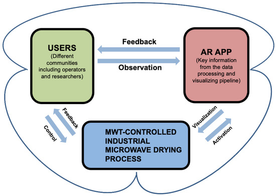 The conceptualization framework of the proposed AR system. MWT-controlled industrial microwave drying process block: This covers the whole running procedure of the process, providing data and elements used for analysis. Users block: This represents the people involved in this context. For instance, the operators who control and run the process and the researchers who observe and analyze the process are the main composition of this part. AR App block: This entails the AR implementation, which was a mobile AR App developed on iOS/Android platform at the initial stage. The App allows different communities of people to get access to the key information from the proposed data processing, visualize workflow interactively, and conduct the onsite analysis collaboratively [6].