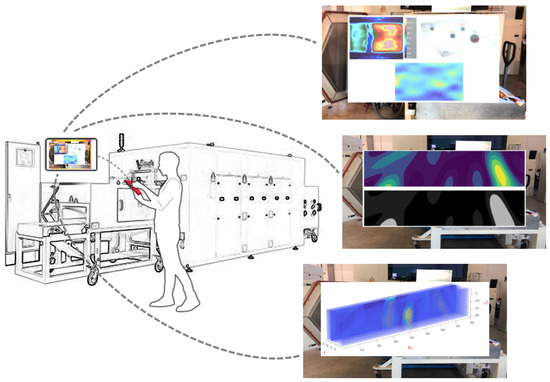 Industrial process tomography (IPT), as a non-intrusive and commonly-used imaging technique, has been effectively harnessed in many manufacturing components for inspections, monitoring, product quality control, and safety issues [1,2,3,4,5,6]. IPT underpins and facilitates the extraction of qualitative and quantitative data regarding the related industrial processes, which is usually visualized in various ways for people to understand its nature, measure the critical process characteristics, and implement process control in a complete feedback network [7]. Some typical representatives of IPT, such as microwave tomography (MWT) [8,9,10,11,12,13,14,15], electrical resistance tomography (ERT) [16], and electrical capacitance tomography (ECT) [17] are widely used for industrial purposes such as moisture detection [8,9], crack detection and powder flow in pipes, and flow pattern detection of granules. In our study, we concentrate on a unique industrial microwave drying process [10] which uses precise drying and heating equipment for polymer foams with the aid of MWT, as displayed in Figure 1. The targets of this drying process are firstly heating the object foam placed on the conveyor belt and then detecting the post-drying moisture distribution, by adopting the MWT technique. In this context, it is therefore critical for domain users to comprehend and interpret the process data for intelligent control purposes. Hence, how to develop effective tools or systems which provide people with straightforward and comprehensible visualizations pertaining to the process data becomes a central topic. In this work, we propose a novel and comprehensive solution to support process-critical visualization analyses through the specific case–the MWT-controlled industrial drying processes–by exploiting the interactive augmented reality (AR) technique.