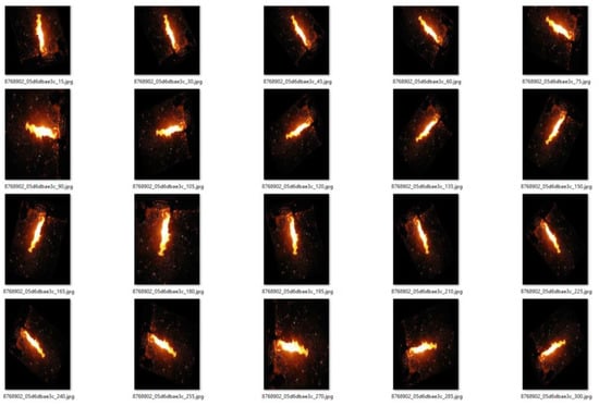 We increased the number of images in the dataset by rotating each collected image at 15° angles from 360°, as shown in Figure 1. Dataset augmentation artificially expands the training set by creating modified copies of the examples already present. After applying this method, we acquired 23 times more images than before. Consequently, each image generated 23 augmented frames. As mentioned earlier, our dataset comprised 9200 images. After augmentation, the total number of datasets exceeded 211,600. In addition, more than 20,000 fire-like images were added to prevent false-positive results, as presented in Table 2. The effectiveness of CNN architectures significantly depends on the number of training datasets. Hence, it is important to extend the training dataset by data augmentation.