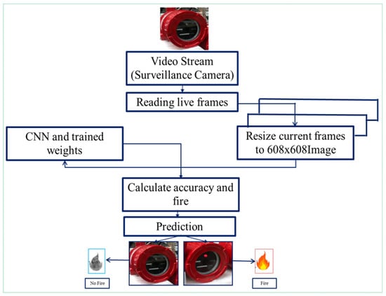 In this subsection, we provide a brief overview of the proposed method for detecting fire candidate areas quickly and accurately, irrespective of the size and shape of fires. In our approach, several techniques were developed to achieve our goal. As illustrated in Figure 3, we first captured live video sources from a real-time fixed camera. Secondly, we resized the input images to 608 × 608 pixels using the OpenCV framework. In our study, we also used 320 × 320 and 416 × 416-sized images, but they decreased the image size, resulting in a decrease in the flame detection accuracy and loss of important features of the fire images.