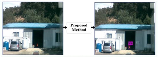 Ba et al. [] developed a new CNN model, SmokeNet, which incorporates spatial and channel-wise attention in CNN to enhance feature representations for scene classifications. Luo et al. [] proposed a flame recognition algorithm based on the motion properties of smoke and a CNN. First, they distinguished the candidate pixels based on the background dynamic frame and foreground dynamic frame references. Subsequently, the highlights of the candidate pixels were automatically extracted by a CNN containing five convolutional layers and three fully connected layers. In [], Park et al. proposed a fire detection method for an urban environment using static ELASTIC-YOLOv3 for the nighttime environment. As the first step of the algorithm, they proposed the use of ELASTIC-YOLOv3, which can improve the detection performance without increasing the number of parameters by improving YOLOv3, which is limited to the detection of small objects. In the second step, they proposed a method to generate a dynamic fire tube according to the characteristics of the flame. However, conventional nighttime fire flame detection algorithms face the following shortcomings: a loss of color information, relatively high brightness value compared to the surroundings, various changes in the shape and size from light blurring, and movements of the flames in all directions; in contrast, daytime flames tend to move in an upward direction. To analyze a fire emergency scene, a new approach was introduced recently to use deep convolutional image segmentation networks to identify and classify objects in a scene based on their build material and their vulnerability to catch fire [].