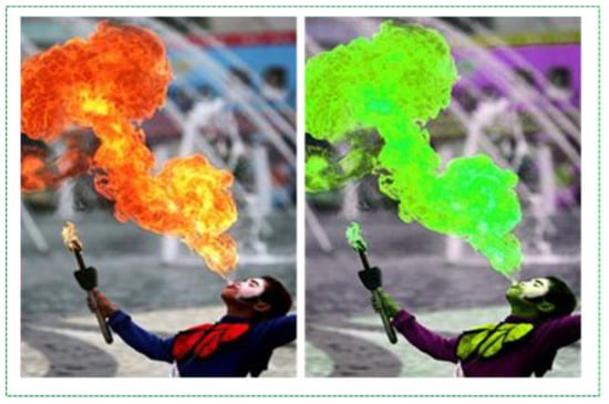 This caused false alarms and increased the inconvenience in real time. After these errors, we made certain changes to the second experiment. After reviewing all the parameters in the training, we realized that color-based augmentation reduced the training accuracy instead of improving it. We realized that it was good that this augmentation was not used for our data because the fire did not have a specific shape and the importance of color retention was high. In Figure 6, we can observe the data changes when hue, saturation, and exposure are randomly used during training. The color of the flame changes to a completely different color, and training leads to an error.