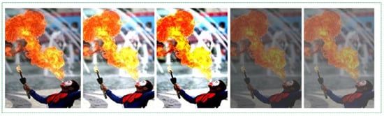 As stated in Section 3.1, we had 211,600 fire images and 20,000 fire-like images. As aforementioned, after deleting low-quality and low-resolution images from the dataset, we obtained a total of 208,300 images. After changing the contrast and brightness of the fire images, we increased the total number of images to 624,900, as shown in Table 4. Firstly, we doubled the contrast of the original input images. Then, we reduced the brightness of the original image by half.