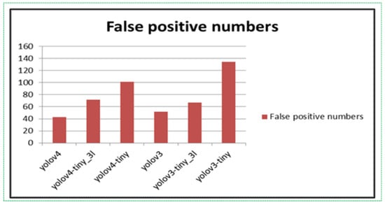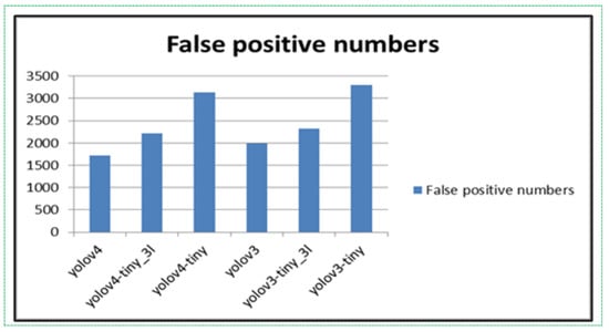 The weighted files trained in the default algorithms recorded as many errors as shown in Figure 9. Even though the fewest errors were shown by the YOLOv3 and YOLOv4 algorithms, it was classified as having a large false-positive detection rate. After adding fire-like images to the dataset, the weighted files were trained again, and the experiments showed 20 times fewer errors than the weighted files in the default algorithms, as shown in Figure 10.