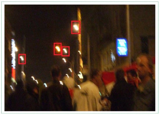 It is difficult to say that the methods proposed thus far do not have any shortcomings. Our proposed method may also cause errors and consider electrical lamps as real fires. This mainly occurs at nighttime because several objects suffer from blurring problems, as illustrated in Figure 14. Fire detection can be difficult during a rainy night. To overcome this problem, we are currently experimenting with datasets containing fire-like images at night in urban areas. In addition, in [], a CNN-based model was proposed to solve blurry environments and generate sharp video frame sequences efficiently. We will apply this method to illuminate blurring aspects in the future. Irrespective of the aforementioned problems, the experimental results showed that our method is very robust and effective for fire detection (accuracy 99.7% and average FM 98.9%).
