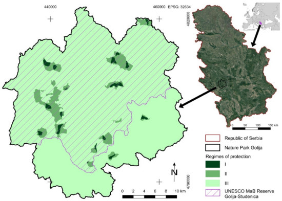 - Decree on the protection of the Nature Park Golija, Official Gazette of RS, No. 47/2009-3. (In Serbian). Available online: https://www.pravno-informacioni-sistem.rs/SlGlasnikPortal/eli/rep/sgrs/vlada/uredba/2009/47/2 (accessed on 15 April 2021).