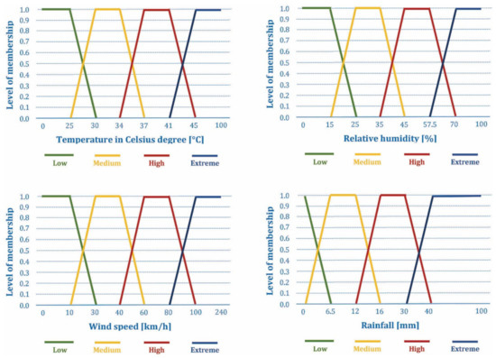 The adopted fuzzy AHP method, as discussed in Section 4.1, is based on the measuring the meteorological parameters (temperature, relative humidity, wind speed, and rainfall) and the concentrations of the chemical gases (oxygen, carbon monoxide, and carbon dioxide) that are responsible for forest fire ignition. This real-time environmental monitoring of the aforementioned forest fire risk factors is performed by a distributed and IoT-based sensor network. Corresponding sensors are deployed in the given area, with the decreasing node density as the forest fire susceptibility decreases, considering the results of analysis with the fuzzy AHP method presented in Section 3. The sensor node location is considered known due to planned deployment (i.e., the information could be written in sensor node software, or the unique sensor node ID could be defined with the corresponding location information written in the system database). Alternatively, each sensor node can be equipped with a Global Positioning System (GPS) module, which would increase the power consumption and cost of the sensor node. Each sensor periodically collects the measured data and employs the fuzzy logic Mamdani inference system [57,58] that has been adopted to analyze the complex environmental changes. Seven input variables measured by sensors are fuzzified using the four membership functions shown in Figure 2 and Figure 3. Different fuzzy sets are defined for each linguistic variable expressed as “very low”, “low”, “normal”, “high”, and “extreme”, which is presented in Table 3.