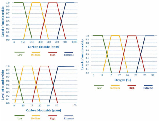 The adopted fuzzy sets for the forest fire risk are designed according to the rule of 30, which is considered as a relevant preventive model of forest fire risk [57]. This rule considers measurements of temperature and wind speed above 30 °C and 30 km/h, respectively, with the humidity values below 30%, as the environmental conditions that favor the forest fires’ occurrence. The adopted fuzzy sets for the fire outbreak occurrence are proposed and designed, [57], based on the occurrence of the unusual increases in carbon monoxide and carbon dioxide levels above their typical environmental concentrations at forest areas, at the same time as the occurrence of the unexpected oxygen level decrease below 21%.