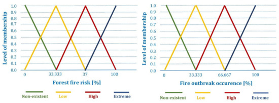 The proposed fuzzy inference system has two output variables, i.e., forest fire risk estimation and forest fire outbreak detection for the fire prevention and detection purpose, respectively. In order to prevent fire occurrence, fuzzified values of the last measurement and its average for meteorological variables (temperature, relative humidity, wind speed, and rainfall) are compared with the aim of evaluating the existence and severity of forest fire risks in the particular zone. Therefore, the considered output linguistic variable is the existence of forest fire risks expressed as “nonexistent”, “low”, “high”, and “extreme”. In order to detect fire occurrence, fuzzified concentrations of chemical gases (oxygen, carbon monoxide, and carbon dioxide) are compared with the respective average values in order to evaluate the probability that the fire outbreak recently occurred. The same output linguistic variables were used to calculate the probability of fire detecting as for fire prevention.