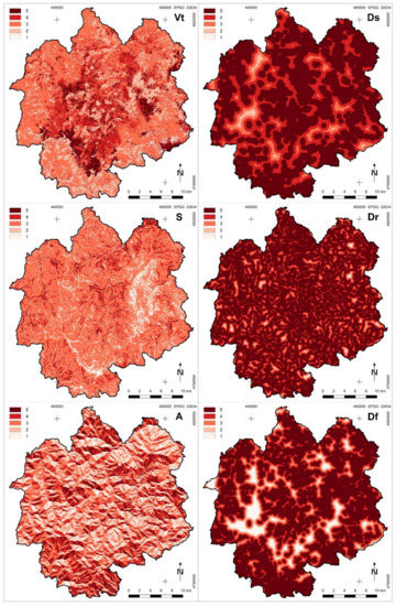 Slopes steeper than 35°, which are the most prone to fires, occupy 1.3% of the total research area. Highly prone areas with terrain slope between 25° and 35° are found on 13.2% of the nature park, and moderately prone terrain with steepness from 10° to 25° covers the remaining 66.8%. South-oriented hillsides cover 10.3% of the total area. The share of other classes of slope, aspect, as well as distance from buildings, roads, and agricultural areas, in the total nature park area can be found in Table 5, and their spatial distribution is shown in Figure 5.