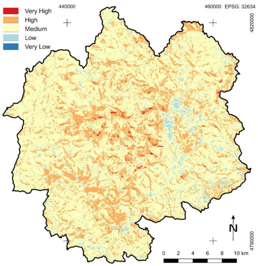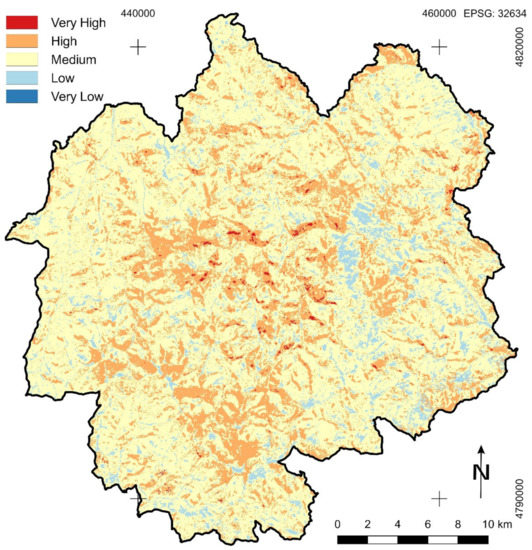 Each factor is analyzed separately and classified with the assigned values from 1 to 5, where 5 indicates the highest and value 1 indicates the lowest susceptibility to the occurrence of forest fires. Vegetation type is the most important factor for determining forest fire susceptibility. Coniferous vegetation, which contains resins and oils, is most susceptible to fire occurrence. Dry shrubs are also suitable for the occurrence of this disaster, while in broad-leaved forests, the probability is significantly reduced. Topography is an important physiographic factor that affects the fire proneness of the area [11]. Fire spreads faster at higher slopes by preheating, drying, and increasing the combustion of the available fuels in the canopy [32,33]. Fire travels most rapidly up steeper slopes and the least rapidly down slopes; therefore, terrain slope must be given significant importance in the determination of forest fire susceptibility. One aspect is another feature of topography that must be taken into account. It determines the amount of solar radiation that a particular area receives and affects the humidity of the vegetation.