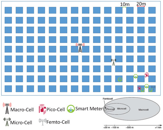 Due to all these considerations, low-power wide-area networks (LPWAN) will be the most suitable option for smart metering in the context of the smart grid [2]. As LPWAN communication technologies have been standardized in the last few years, they are very attractive for both smart grid and wider internet of things (IoT) applications. Different properties and aspects of emerging LPWAN technologies have been discussed in these references [3,4] in more detail. The third-generation partnership project (3GPP) introduced its LPWAN solution, narrow-band IoT (NB-IoT), in its LTE Release 13 [5]. The use of NB-IoT technology [2] has been studied recently for smart metering or smart grid applications. Some comparative studies regarding deployment cost, latency, range and other aspects have been summarized in [4]. Simple energy consumption and throughput modeling of NB-IoT in comparison with general packet radio service (GPRS) technologies has been discussed in [6]. Compared to other LPWAN technologies, using NB-IoT is advantageous due to the low-cost chipset, better building penetration and lower power consumption due to the simpler waveform. Due to these advantages will be the best option for static IoT devices such as smart meters. In [7], a prototype system including NB-IoT devices, an IoT cloud platform, and an application server has been tested. Other important aspects of NB-IoT which needs to be addressed are the capacity and coverage which are discussed in [8]. Finally, in [9], the authors conducted NB-IoT network performance analysis in a real-world indoor environment. The small cell concept has been defined as low-power access points that operate in licensed spectrum to improve cellular coverage and capacity and can be deployed in homes and enterprises [3]. Small cells can enhance MTC device coverage and provide a backhaul link over an internet connection to the core network.