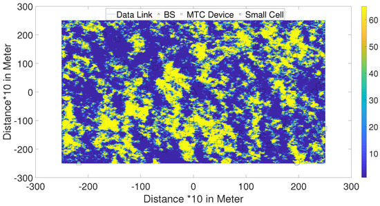 - A shadow-fading map is created using the algorithm in the Appendix of [13]. The BS is located at the center of the map with randomly spread UE devices around the map as can be seen in Figure 2.