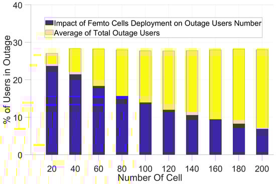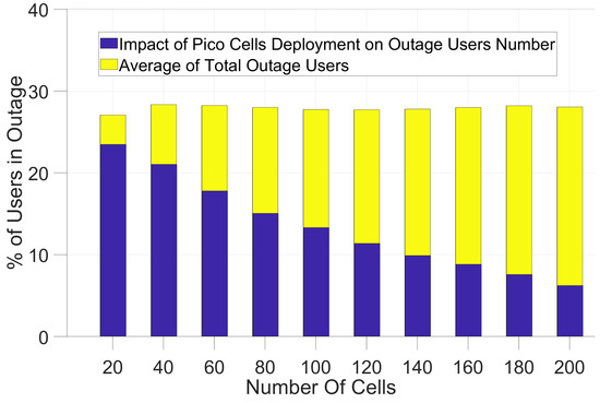 In Figure 5 and Figure 6 and Table 4, the results of the small cell communication scenario described in Figure 1 has been shown. Using the path-loss models and shadow-fading values for small cells, we simulated the coverage impact of pico-cells and femto cells. First, we analyzed the improvement of coverage for users in outage as can be seen in Figure 1 and Figure 2 for the path-loss model shown in Equations (2) and (3).