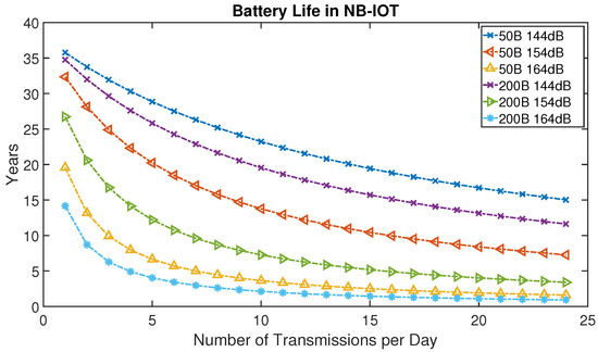 NB-IoT battery lifetime analysis for short data packets of 50 bytes (B) and 200 bytes (B) for Different MCL.