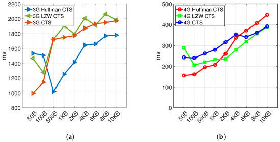 Finally, in the experimental section, we have explored the characteristics of Huffman and LZW compression algorithms on 3G and 4G cellular communication technologies, and the impact of these compression algorithms on latency has been evaluated. It was found that Huffman coding generally performed better than LZW and could offer a modest reduction in communications latency of up to 10–20%. But for data packets close to the maximum transmit unit (MTU) in TCP, the Huffman performance will increase 30–40%. This better performance is because communicating one MTU in TCP protocol can be transmitted in a single network-layer transaction.