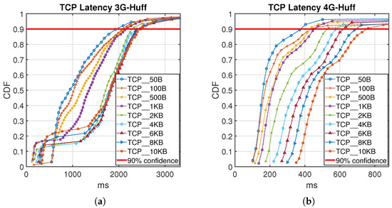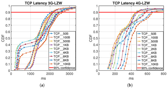 Figure 9 and Figure 10 show the Cumulative Distribution Function (CDF) of collected latency measurement from the testbed in detail for both 3G and 4G cellular network using LZW and Huffman coding algorithms. The red line plotted in the figures represents a 90% confidence latency value for the obtained results.