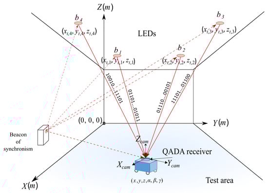 Figure 1 shows a general scheme of the proposed IRLPS. In this proposal, we consider three independent coordinate systems: x, y and z denote the Cartesian coordinates in the global coordinate system, with the origin at the corner of the room. The camera coordinates are denoted by , and with the origin located at the center of the square aperture in the receiver. Finally, and represent the local 2D coordinates of the photoreceiver QADA in which its origin is placed at the centre of the QADA. The receiver’s complete pose is denoted as x, y, z, , and , where is the rotation angle around the z axis of the receiver. Note that since the receiver is placed on top of a mobile robot and the plane corresponds to the floor plane, then and .
