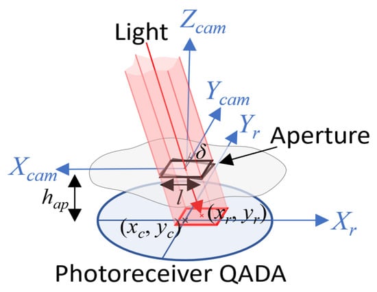 where the aperture misalignment , the central point ( and ), the aperture length l and the ratio between the expected focal length and the actual focal length where have all been considered [20]. The image points in Equation (3) are geometrically related with the transmitter’s 3D coordinates as follows: