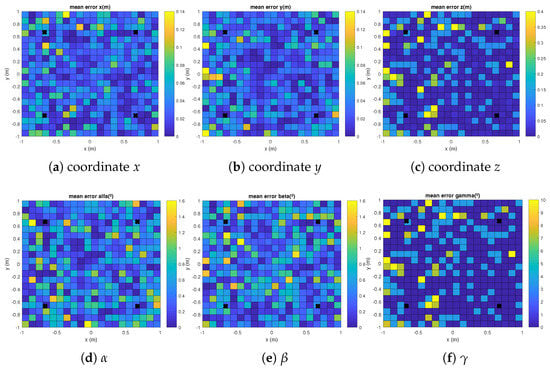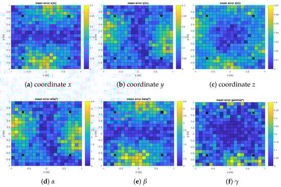 The mean absolute errors for each coordinate and for the aforementioned EPnP, IPPE and RPnP algorithms are plotted in Figure 3, Figure 4 and Figure 5 with 120°. It can be observed how the errors in the grid of considered points are linked to the distance between the transmitters and the receiver, thus providing slightly higher errors in the corners of the proposed scenario. Similar results are found for {0°, 240°}.
