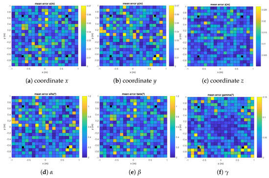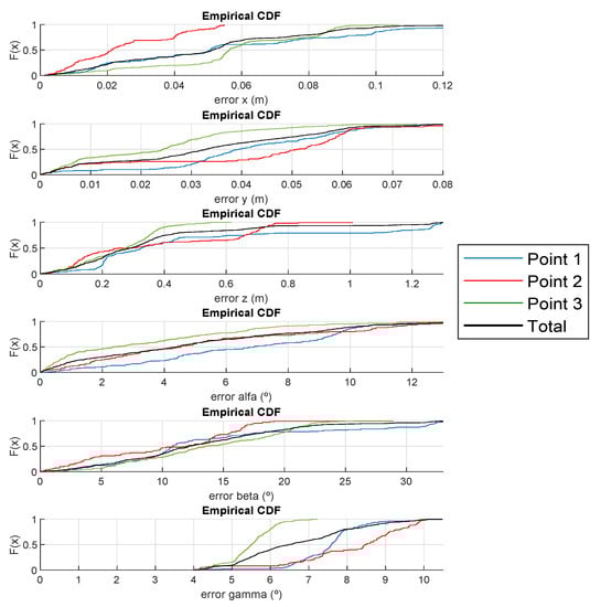 Table 2 details the average and median absolute errors as well as the standard deviation for the analysed points with {0°, 120°, 210° and 300°}, performing 50 realizations at each point. The obtained results for coordinates x, y and z are cm, cm and cm for the total average absolute error and cm, cm and cm for the standard deviation, respectively. In addition, the obtained results for the rotation angles , and are °, ° and ° for the total average absolute error and °, ° and ° for the standard deviation, respectively. It is worth mentioning that points beyond 3 are treated as outliers and are not taken into consideration in the analysis. Note that 3 includes the % of all the data.