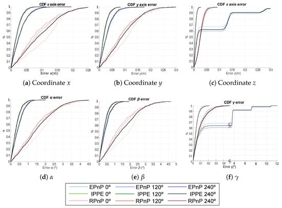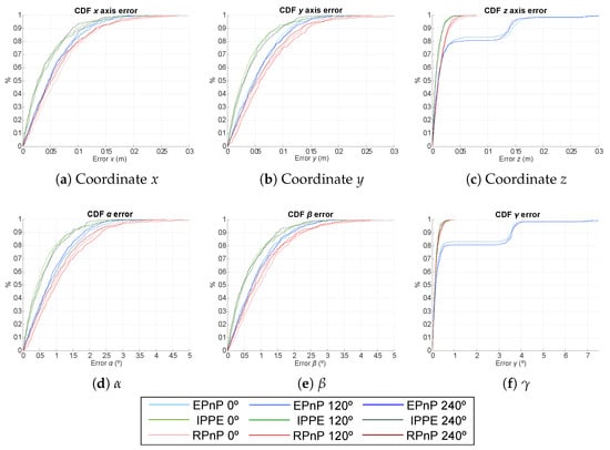 For clarity’s sake, the Cumulative Distribution Function (CDF) of the absolute pose error is presented in Figure 6 for the EPnP, IPPE and RPnP algorithms with {0°, 120°, 240°}. The errors in the estimation of the 2D coordinates (x and y) are below 10 cm for the IPPE and EPnP algorithms and below 20 cm for the RPnP algorithm. In addition, the absolute error related to coordinate z is 3 cm, 7 cm and 30 cm for the IPPE, RPnP and EPnP algorithms, respectively. On the other hand, the errors in the estimation of the rotation angles and are below ° for the IPPE and EPnP algorithms, whereas the errors are below 4° for RPnP. Finally, the absolute errors in the estimation of are °, ° and 10° for IPPE, RPnP and EPnP, respectively.