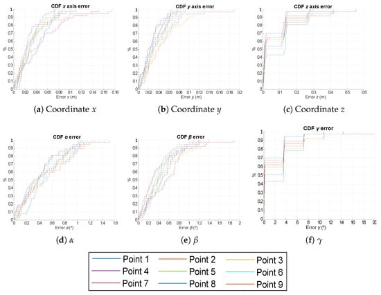 CDF of the absolute pose errors for the nine representative points defined in Table 1 for the case of using the RPnP algorithm.