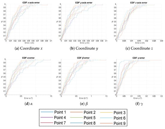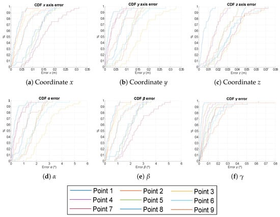 CDF of the absolute pose errors for the nine representative points defined in Table 1 for the case of using the IPPE algorithm.