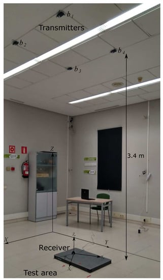 The experimental tests have been conducted in a room of m with a height of m under normal light and noise conditions (see Figure 11). The LED beacons have been located on the ceiling of the room in its central part distributed in the four corners of a square with a m length, whereas the receiver is placed on the floor of the room. It has been verified in simulations that the most suitable algorithm in this proposal is the IPPE algorithm; therefore, hereinafter, only this algorithm has been considered for estimating the pose of the receiver in experimental tests.