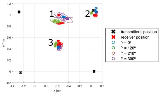 The receiver has been calibrated so that all the parameters in (3) are known. These parameters are obtained by minimizing the positioning error by using iterative methods, such as a Branch and Bound algorithm and a Linear Least Squares algorithm. The aperture height is set at = mm, the optical centre is located at (, ) = (, ) mm, the focal length adjustment is , the aperture misalignment is = rad and the aperture length is l = mm. In addition, an Optitrack system [33] has been applied to obtain the real positions (ground truth) of the transmitting beacons and the receiver. This high-accuracy motion capture system is based on a set of cameras placed around the room that permit obtaining the position of the object under analysis with an accuracy of mm. Note that the measurements with the Optitrack system are not simultaneous (they are made sequentially), as the IR emitters used by the Optitrack system saturates the QADA receiver. Three points have been experimentally analysed, as observed in Figure 12 for {0°, 120°, 210° and 300°}. These angles are selected to verify that all the quadrants behave similarly.