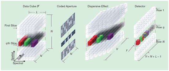 In particular, the CASSI-based sensing produces a 2D matrix of FPA measurements (shot) from the original datacube. Recall that N represents the spatial dimensions in the original datacube and is the dimension of the spectral dispersive effect, which depends on the number of spectral bands L. By stacking the values of the 3D datacube into a single vector, the CS formulation for the CASSI setup is: