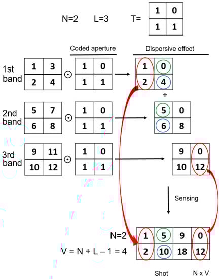 At this point, one of the essential issues is the construction of the projection matrix . This matrix should incorporate the three main steps of the CASSI measurement procedure explained in Section 2: (1) coded aperture, (2) dispersive effect; (3) FPA sensing. Figure 2 and Figure 3 show a small example of the CASSI-based sensing procedure and the corresponding equivalent CS formulation in (12), including the ideas for a systematic construction of the matrix from the matrix , which specifies the coded aperture pattern. As observed, we start from a simple datacube with spectral bands and spatial dimensions, i.e., . These spectral slices are individually coded with the matrix and dispersed by the prism effect (in practice, they are shifted one column to the right). Finally, the values at the same spatial coordinates are summed to simulate the sensing in the pixels of the FPA sensor. According to this procedure, the matrix can be constructed as shown in Figure 3 by considering the equivalent vector CS formulation. The vector representation of the matrix is placed at the matrix following the same pattern: