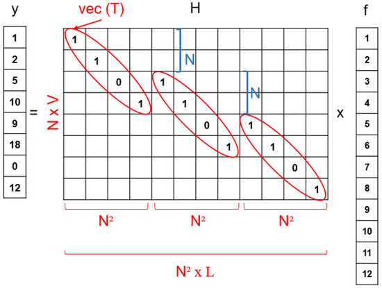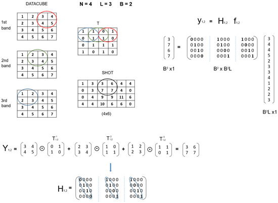 Figure 5 shows a comprehensive example to illustrate the construction of matrices in the block CASSI model. As observed, the circled elements in the datacube slices represent the oblique parallelepiped through the spectral bands when considering a block size . For the construction of the partial matrices, we first have to determine the section of the matrix responsible for encoding the data of the considered parallelepiped at each slice. The same colors are employed to mark the involved sections in the matrix for convenience. In the center of the figure, we show the result of applying the appropriate sections of the matrix to each spectral band in the considered parallelepiped, which eventually produces the corresponding windowed block from the whole measurement shot (in the general model). Finally, at the bottom of the figure, the construction of the appropriate partial matrix for the considered windowed block is presented by assuming the required vectorization in the CS block formulation (see Equation (17)). As observed, it basically consists of vectorizing the involved sections of the matrix , constructing diagonal matrices with the resulting vectors, and stacking them horizontally.