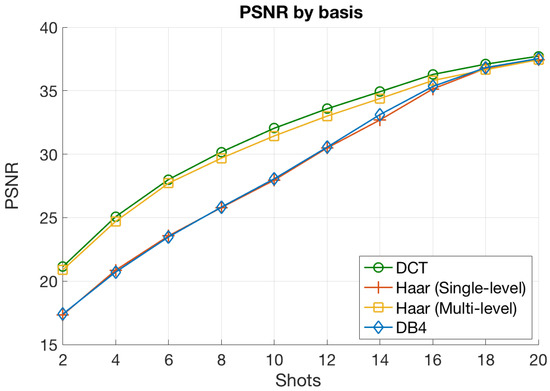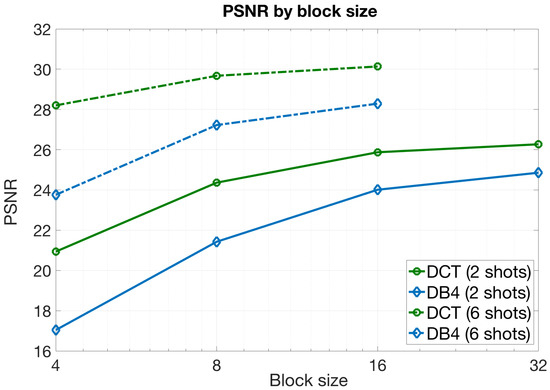 where and correspond to the two spatial dimensions and is the basis for the spectral one. The usual choices to obtain a sparse representation of natural images are the wavelet transform or the DCT [47,48]. The former bases are known to be mutually incoherent with structured projection matrices or even random projections for the sensing step [36,37,49]. The DCT is a transform widely employed in image compression and also in the context of CS [50]. The DCT is especially interesting for the considered scenario because it is able to efficiently compact the signal energy when the input is highly correlated and using a relatively small block size [48].