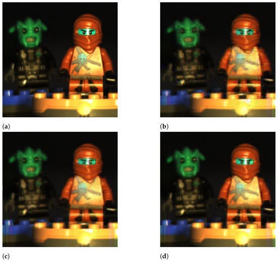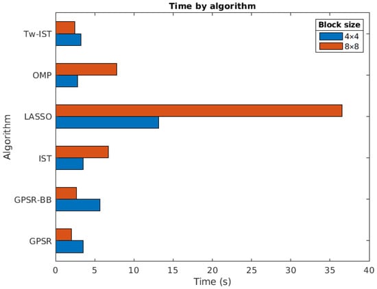 - LASSO was the algorithm that provided the image reconstructions with the highest objective quality. It was able to provide excellent performance in spite of the particular structure of the columns in the CASSI measurement matrix. However, these better results were achieved at the expense of increasing the execution time required for the reconstruction step, especially when employing a larger number of shots or larger block sizes. Hence, LASSO is the best alternative for applications where it is essential to work with high-quality reconstructions, for applications without delay constraints, and for devices with enough computational capabilities;