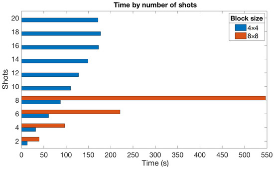 - The best option to improve the quality of the image reconstructions is to increase the number of shots generated from the input scene. If possible, this alternative is preferable to increasing the block size in the block CASSI model, both in terms of quality improvement and required reconstruction time. From the reconstruction perspective, the increase of the generated shots allows producing hyperspectral images with excellent quality at an affordable computational cost and delay. The use of larger block sizes for a given number of shots led to a slight improvement of the reconstruction quality at the expense of increasing the computational cost and reconstruction delay. However, generating more shots implies more hardware complexity, more measurements to be stored/transmitted, and lower compression efficiency. Again, the final decision about the system configuration will depend on the application requirements, the hardware features of the CASSI prototype, and the computational resources of the devices where the hyperspectral images will be reconstructed;