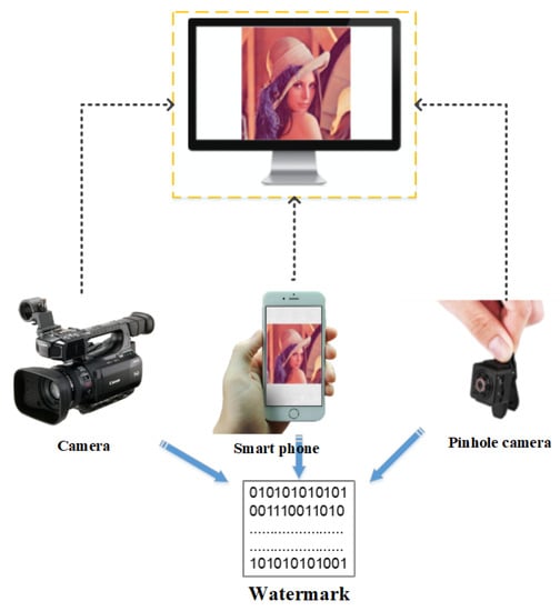 The first is anti-screen shooting based on image coding. These methods use visual characteristics and combine software and hardware to change the brightness of a special display pattern superimposed on the host image or a screen. Cui et al. [] designed a cross-component correlation extraction method to detect image barcode from color images. Nakamura et al. [] proposed a scheme based on an additive template that was added to the host image to embed a watermark. Gugelmann et al. [] developed a coding scheme on the strength of convolutional codes that complements the watermarking and solves the special requirements of screen watermarking. In [], a method was proposed for embedding a watermark in print media that could blindly detect a watermark by using a mobile phone. In [], a parametric print-to-capture channel model and an efficient channel estimation scheme requiring low training overhead were proposed. Nevertheless, the aforementioned methods severely affect the visual quality of the images.