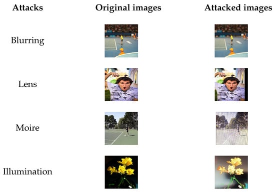 The screen-shooting process can be regarded as a cross-media information transfer process. It contains a special attack and other traditional distortions, such as scale, translation, and rotation and image processing. Kim et al. [] summarized the distortion of the screen-shooting process into four attacks: display, lens, sensor, and process. Among them, Fang et al. [] also proposed three categories: lens deformation, light source deformation, and moiré pattern distortion. In Figure 3, we summarized the four distortions of screen-shooting.